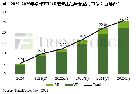 TrendForce:元宇宙热潮,将推升 2022 年 VR/AR 装置出货量至 1202 万台